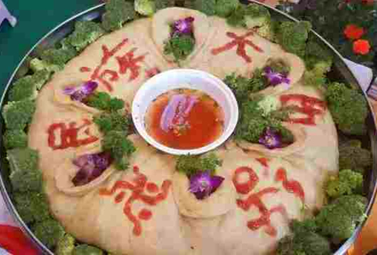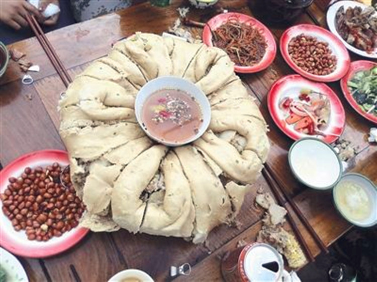 吃“團(tuán)結(jié)包子”時,進(jìn)餐的人們圍坐在一起,把冒著騰騰熱氣、散發(fā)著濃濃香味的包子擺在桌子中央,然后每人面前放上一個小碟子,碟子里盛上蘸水。除此之外,還要打出一壺濃釅的酥油茶。