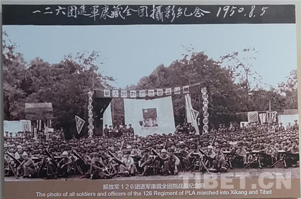在中國(guó)共產(chǎn)黨和中央人民政府提出和平解放西藏的方針,中國(guó)人民解放軍第18軍迅速做好向西藏昌都地區(qū)進(jìn)發(fā)的各項(xiàng)戰(zhàn)斗準(zhǔn)備的同時(shí),云南軍區(qū)第14軍126團(tuán)在沿途人民的援助下,于當(dāng)年7月進(jìn)抵云南德欽,作好了向西藏進(jìn)軍的準(zhǔn)備。圖為中國(guó)人民解放軍126團(tuán)進(jìn)軍康藏全團(tuán)指戰(zhàn)員紀(jì)念照