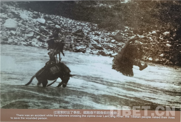 進(jìn)軍途中,因“大理至麗江段土工已完成百分之八十,但路基及橋梁,尚未建筑”,在運(yùn)送物資時(shí)會(huì)使用當(dāng)?shù)亓锼鬟^(guò)江。圖為過(guò)溜索時(shí)出了事故,藏族群眾奮不顧身去搶救
