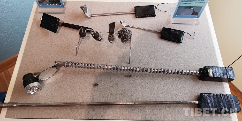 圖為楊永磊設計的管道內(nèi)熔渣挖取工具(圖上部三個)、焊縫外觀檢查工具(圖下部兩個),前者能以鏟、掃、粘或吸的方式將管道內(nèi)熔渣清理干凈,后者以燈照亮焊縫倒映于鏡面,便于觀察刁鉆位置焊縫的實際情況 攝影:李元梅
