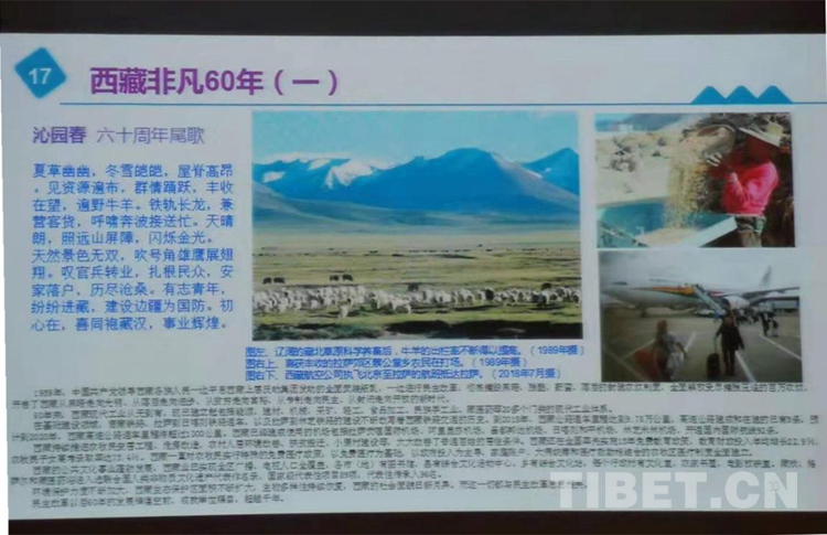 唐召明以照片敘事、詩詞抒情的形式,把西藏60多年來的發(fā)展變化和其間的感人瞬間展示出來,謳歌偉大的時代和詮釋這一偉大時代的“老西藏精神”。經(jīng)北京建藏援藏協(xié)會原副會長朱強配圖賦詩,有了“百首詩詞、百張圖文”的以詩配圖資料。一張張感人的照片和一首首充滿激情的詩歌,展示了在中國共產(chǎn)黨的領(lǐng)導下,新西藏在“短短幾十年,跨越上千年”的歷史巨變;道出了一切為了西藏人民的“老西藏精神”時代內(nèi)涵。全場聽眾凝神專注,不時響起熱烈的掌聲。