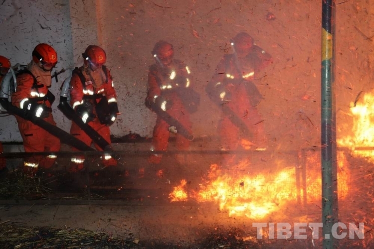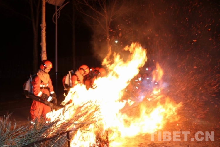 中國(guó)西藏網(wǎng)訊 12月17日晚,西藏自治區(qū)昌都市森林消防支隊(duì)左貢中隊(duì)展開(kāi)了一場(chǎng)夜間實(shí)戰(zhàn)訓(xùn)練,場(chǎng)面火熱。圖為實(shí)戰(zhàn)訓(xùn)練中消防員們互相配合,撲打火線。