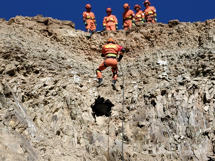 圖為復(fù)雜地形下降訓(xùn)練,進(jìn)一步提高隊員應(yīng)對各種環(huán)境中繩索救援技術(shù)的綜合運(yùn)用能力