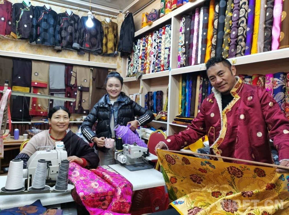 據(jù)介紹,他們的民族服飾產(chǎn)品服裝類,多是由旦周措毛裁剪、縫制。旦周措毛于2010年9月至2011年8月參加了由玉樹市扶貧口免費(fèi)組織的農(nóng)牧民縫紉培訓(xùn)班,后在家里經(jīng)過半年多時(shí)間的苦練,終于出師,可以獨(dú)自縫紉五種以上藏式服裝了。于是,他們兩口子在2013年11月注冊(cè)了公司、在結(jié)古大道拉布寺市場(chǎng)租下門面,經(jīng)營民族服裝。現(xiàn)在,旦周措毛是已是有9年經(jīng)驗(yàn)的縫紉師了,只要用戶說出大致樣子,無論什么樣式她都能拿出令人滿意的成品。記者在鋪?zhàn)永锎私粋€(gè)小時(shí),他們賣出了一件藏式襯衫和短羊皮襖。