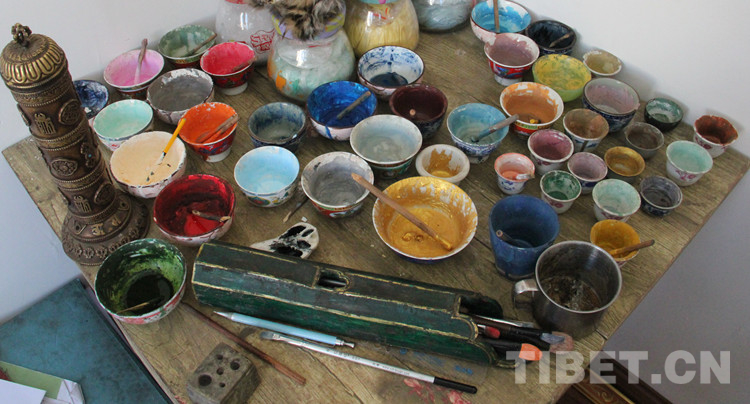 圖為繪制唐卡所用的礦物質(zhì)顏料、畫筆等工具 攝影:李元梅