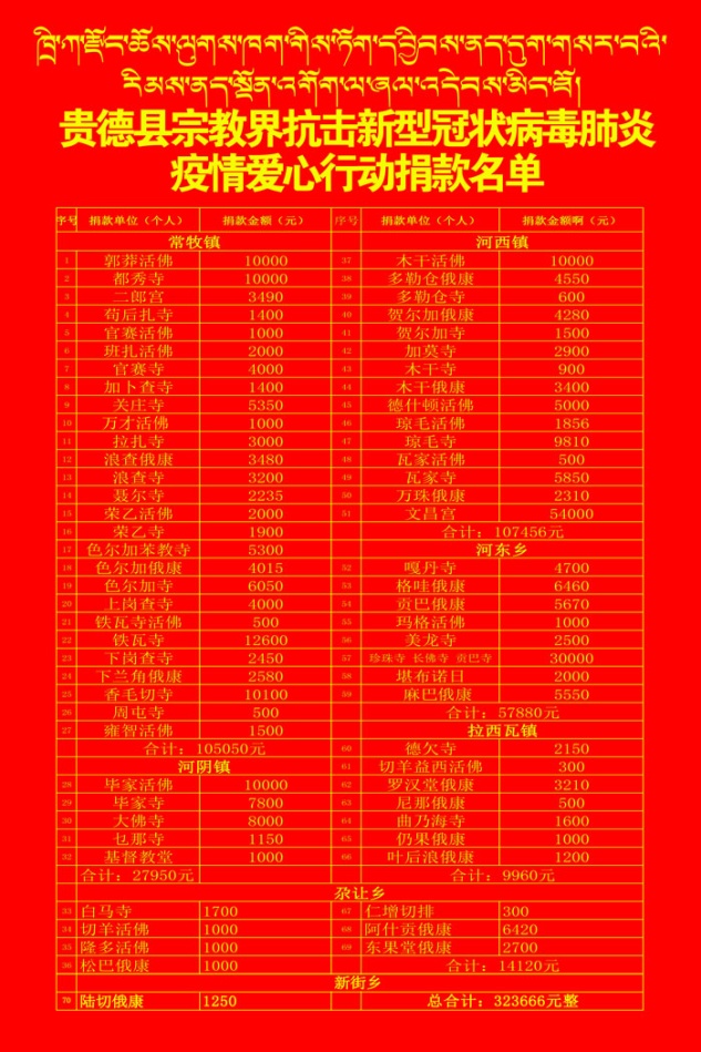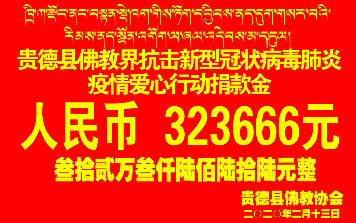 “一方有難、八方支援”。2月7日,隨著疫情防控形勢嚴(yán)峻復(fù)雜,相關(guān)醫(yī)療物資緊缺,貴德縣佛教協(xié)會(huì)主動(dòng)向全縣佛教界提出倡議,為疫情防控工作伸出援手、獻(xiàn)出愛心。截至目前,貴德縣佛教界共捐款323666元人民幣,為疫情防控奉獻(xiàn)愛心。