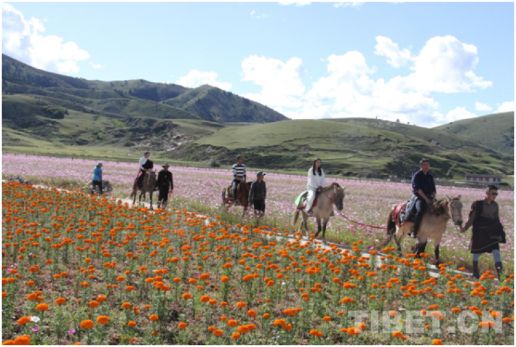 從理塘縣前往稻城亞丁機(jī)場方向60多公里,翻過一座小山坡,一片如夢似幻的花海景觀瞬間映入眼簾。曾經(jīng)名不見經(jīng)傳的小山村——濯桑鄉(xiāng)漢戈村已實現(xiàn)“沙化地”到“花?!钡耐懽儯蔀樾碌木W(wǎng)紅打卡點。在花團(tuán)錦簇間拍照、在草原上騎馬,或者到旁邊康藏陽光種植基地采摘“極地果蔬”、購買農(nóng)民合作社的原生態(tài)農(nóng)副產(chǎn)品……游客可盡興體驗。
