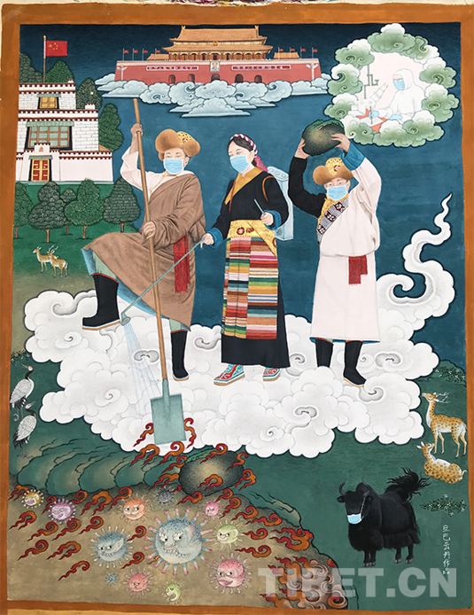 為什么要如此構(gòu)圖,旦巴云丹給出了解釋。新冠肺炎疫情發(fā)生以來,全國人民都在用自己的方式和力量譜寫撼天動(dòng)地的抗疫壯歌,身處雪域高原的人們也不例外。畫面中靠左的男子,揮舞著鐵鍬,想要把病毒掩埋;居中的藏族阿佳在噴灑消毒液;右邊的男子則想用大石塊將病毒粉碎。他們戴著口罩、身著藏族服飾,用不同的方式驅(qū)趕病毒,這是普通西藏群眾的心愿:希望早日消滅病毒。