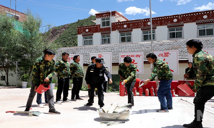 中國(guó)西藏網(wǎng)訊 “拔下保險(xiǎn)銷(xiāo),讓噴嘴對(duì)準(zhǔn)火焰根部……”46歲的尼瑪一邊講解一邊演示滅火器使用方法和注意事項(xiàng),身邊幾位穿著迷彩服的學(xué)員正認(rèn)真觀察并模仿著。