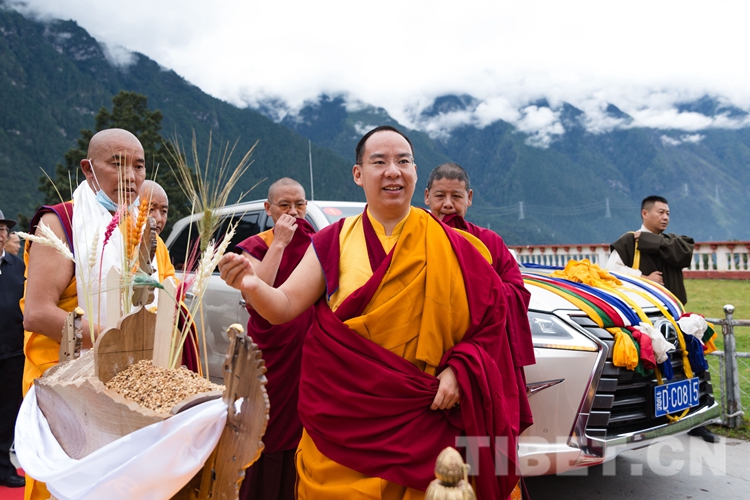 9月2日,山間云霧還未散去,寺院僧人早已整齊列隊,高舉幡幢,手持香爐、法號,恭迎全國政協(xié)常委、中國佛教協(xié)會副會長、中國佛教協(xié)會西藏分會會長班禪額爾德尼?確吉杰布的到來。