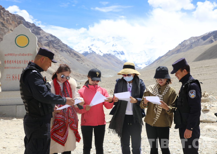 圖為珠峰邊境派出所民警在珠峰大本營執(zhí)勤點(diǎn)向游客開展生態(tài)環(huán)境保護(hù)宣傳 攝影:畢琦