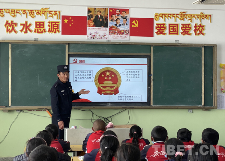 圖為崗嘎邊境派出所民警在崗嘎鎮(zhèn)中心小學(xué)教室內(nèi)為學(xué)生開展愛國主義教育 攝影:陸佳希
