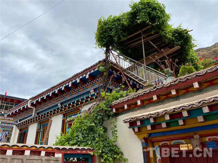 與同行者贊嘆一番,我的目光緩緩下移。在葡萄架側(cè)下方的房頂上,擺放著一排花盆。眾人皆知藏族愛花,即使在冬季,居民也會在陽臺養(yǎng)著幾盆花。如今進(jìn)入雨季,主人把一盆盆花兒搬上房頂,與遠(yuǎn)方的朋友共享好時光。