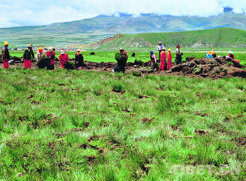圖為為保護藏北高原上的生態(tài)植被,中鐵五局職工同藏族群眾一起,將修“天路”處的草皮移走,養(yǎng)植在旁邊。待日后鐵路修通后,再將它移植到鐵路路基的邊坡上(唐召明2003年攝)