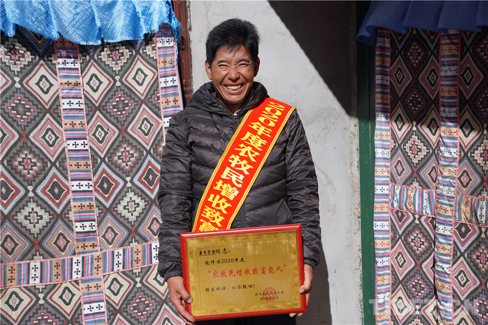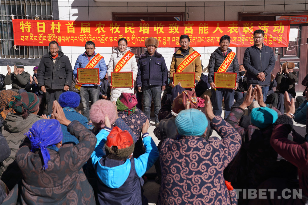 在表彰活動現(xiàn)場,高掛著特日村首屆農(nóng)牧民增收致富能人表彰活動的大紅橫幅。洛桑白珍、尼瑪、格桑頓珠、桑杰巴珠四人身掛“2020年度農(nóng)牧民增收致富能人”綬帶接受表彰。在村“兩委”班子成員為這四人獻(xiàn)哈達(dá)、發(fā)獎牌和每人500元的獎金時,現(xiàn)場的氣氛更是達(dá)到了高潮。