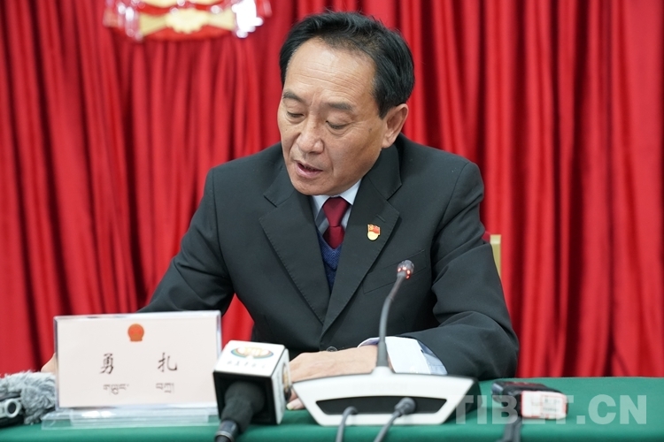 圖為西藏自治區(qū)人大法制委員會副主任委員勇扎介紹有關(guān)情況 攝影:王淑