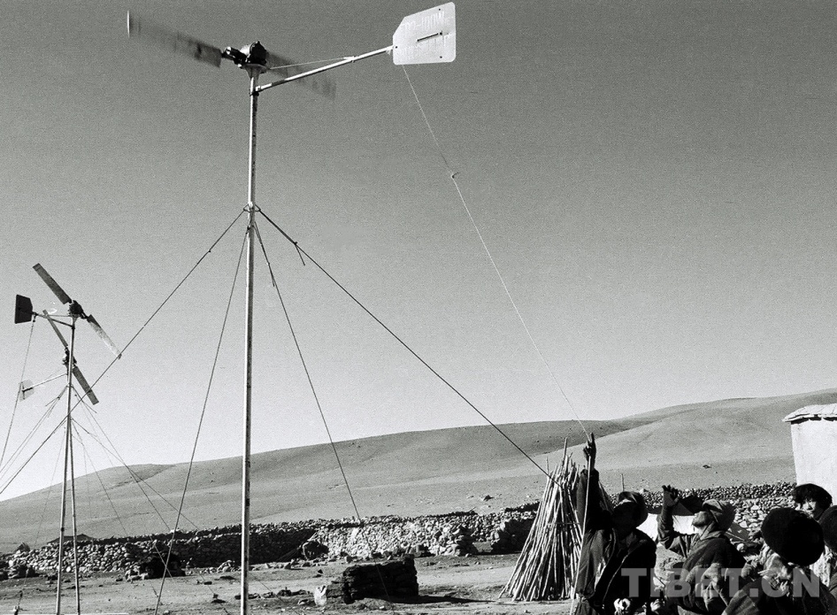 圖為那曲風(fēng)能實(shí)驗(yàn)站技術(shù)人員為雙湖辦事處(現(xiàn)改為雙湖縣)嘎措鄉(xiāng)牧民檢修保養(yǎng)所安裝的風(fēng)力發(fā)電機(jī) 唐召明1988年攝