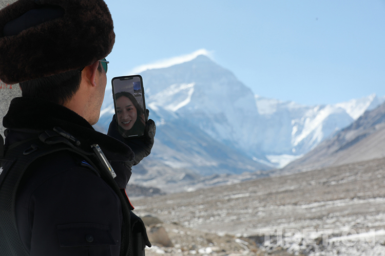 圖為王蘭波巡邏至珠穆朗瑪峰大本營(yíng),與家人視頻分享珠峰美景 攝影:彭維熙