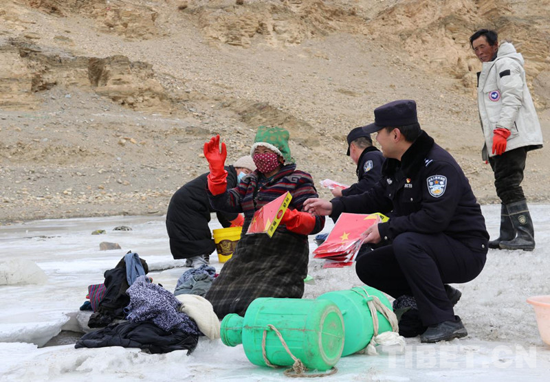 在群眾家里、街道上、冰河上,直克鄉(xiāng)邊境派出所民警向群眾送出了一面面嶄新的國(guó)旗,鮮紅的國(guó)旗映紅了每個(gè)人的臉龐,將揚(yáng)帆啟航新征程的祈愿深入每個(gè)人的心中。直克鄉(xiāng)索白村退伍老兵朗加激動(dòng)地說(shuō):“國(guó)旗是祖國(guó)的象征和標(biāo)志,需要共同守護(hù)。在雪域高原上,你們戰(zhàn)嚴(yán)寒、耐寂寞,披星戴月、頂風(fēng)踏雪,燃起了警民‘共話護(hù)邊’的愛(ài)國(guó)熱情,謝謝你們用實(shí)際行動(dòng)溫暖著我們。”
