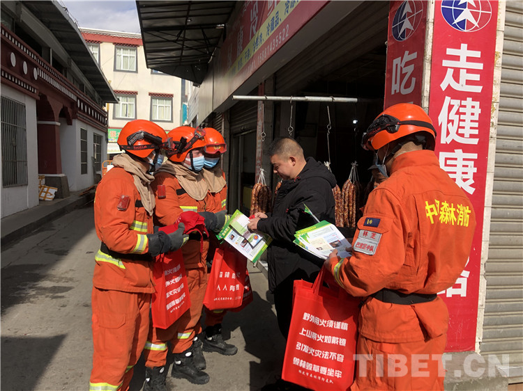圖為米林縣森林消防中隊(duì)指戰(zhàn)員們走街串巷向居民們宣傳防火小常識并發(fā)放宣傳資料