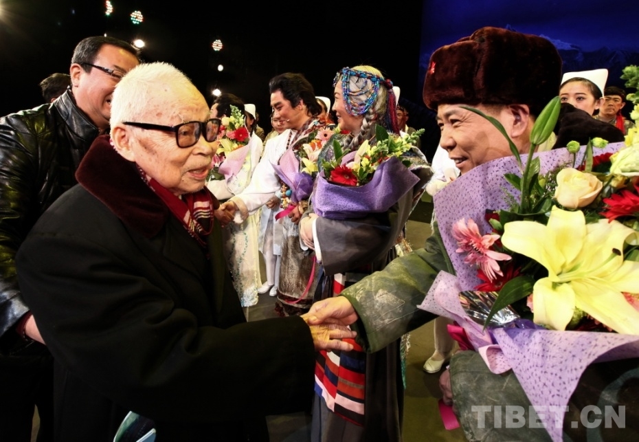 圖為北京建藏援藏工作者協(xié)會學習指導老師陰法唐將軍在中國評劇院所創(chuàng)作的評劇《藏地彩虹》試演結束后,上臺握手祝賀(唐召明2017年12月10日攝)