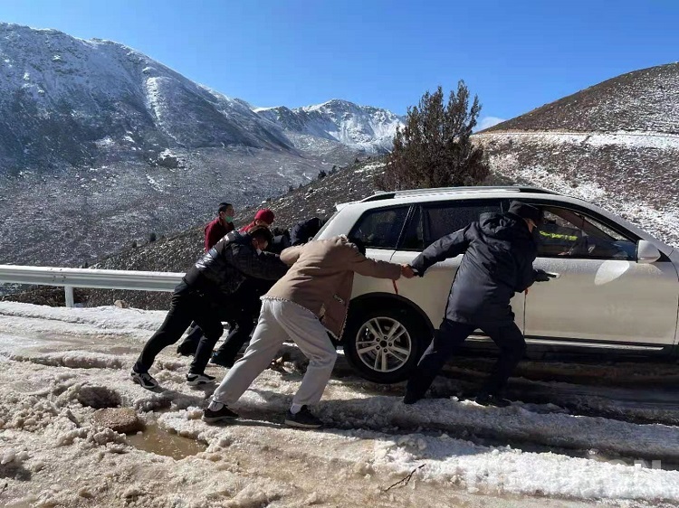 面對焦急萬分的父親,為了讓病中的孩子第一時間得到醫(yī)治,根秋降澤立即下車施救。由于鄉(xiāng)村道路路況較差,加之冰雪覆蓋,車輛打滑嚴(yán)重,施救過程十分艱難。根秋降澤憑借多年應(yīng)對冰雪路況的駕駛經(jīng)驗(yàn),組織大家在極度嚴(yán)寒、工具缺乏的情況下,通過刨冰除雪、手推車?yán)姆绞?,?jīng)過半個多小時的努力終于讓被困車輛擺脫困境。根秋降澤捂著凍僵的手,一再提醒駕駛員要常備防滑鏈條,在冰雪路段需小心謹(jǐn)慎駕駛,切勿急打方向等注意事項(xiàng)。