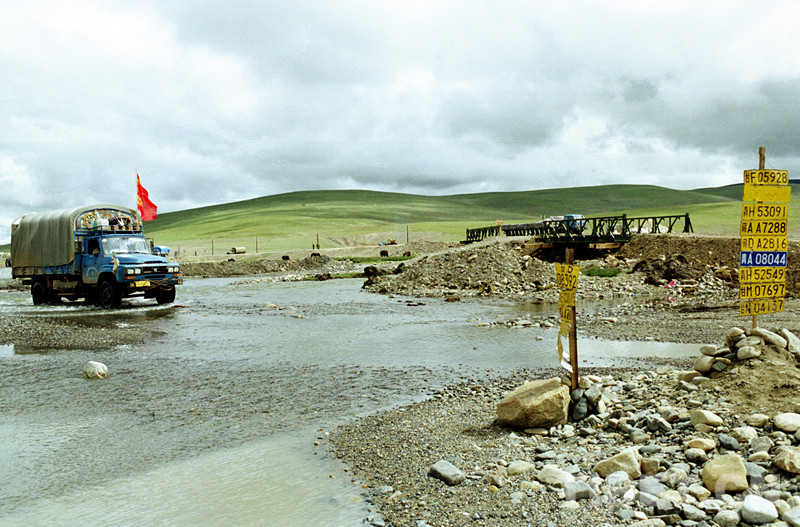 這座鐵橋長(zhǎng)180多米,橫跨在藏北最大內(nèi)流河扎加藏布江上,是前往文部辦事處和雙湖辦事處的必經(jīng)之地。每次只能通過(guò)一輛汽車,汽車上橋常壓得橋板“吱吱嘎嘎”亂響,讓司機(jī)無(wú)不提心吊膽。每逢夏季,橋兩邊的公路軟得像海綿一樣。汽車在這里陷進(jìn)泥漿是常有的事。這里是汽車司機(jī)開(kāi)車最為頭痛的地方。