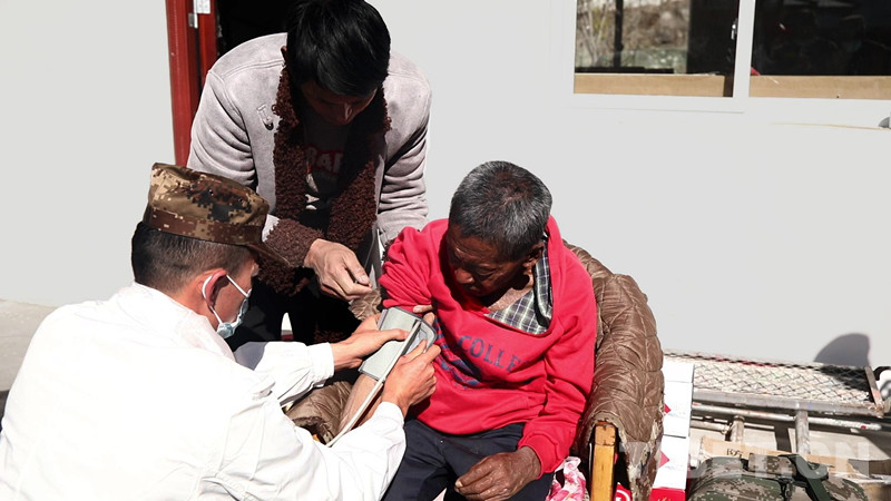 圖為軍醫(yī)幫老人檢查身體