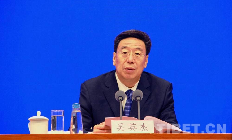 圖為中共西藏自治區(qū)委員會書記吳英杰在發(fā)布會上介紹西藏發(fā)展情況 攝影:劉莉