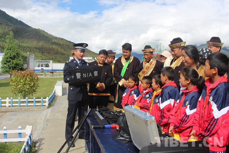 圖為羌納邊境派出所民警正在向轄區(qū)老黨員和小學(xué)生展示警械 攝影:李成