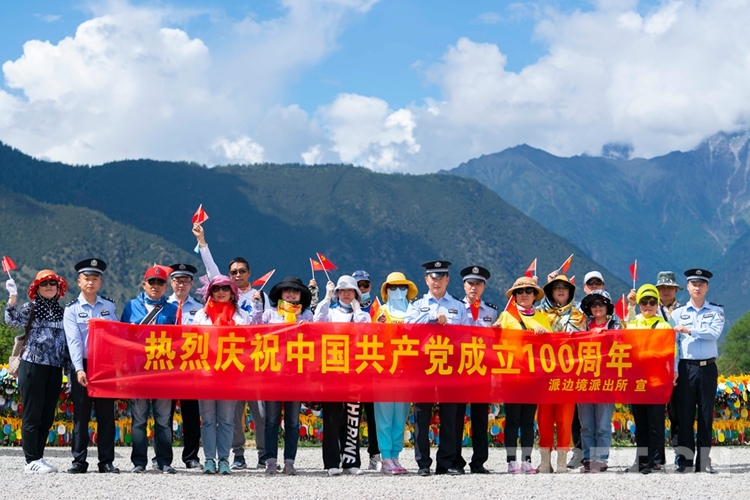 圖為派邊境派出所民警與游客共同祝福黨的生日 攝影:江才云旦