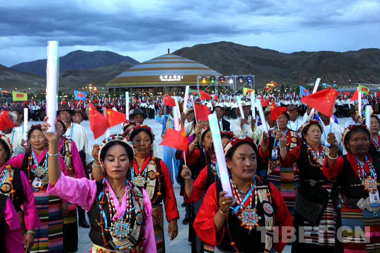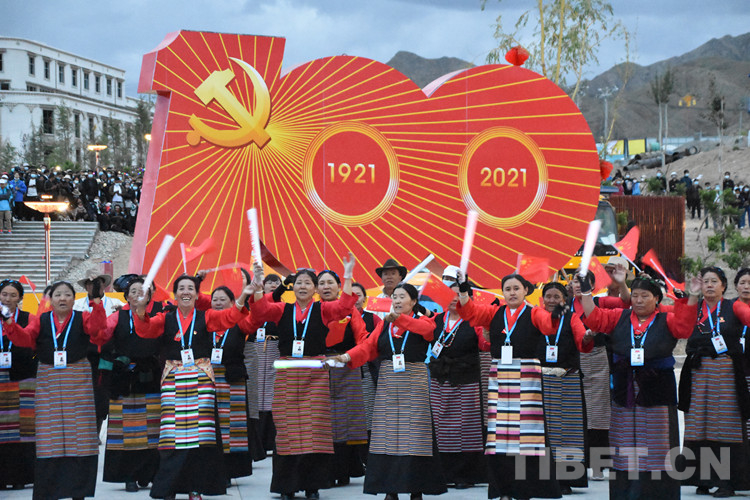 珠峰文創(chuàng)園區(qū)的聯(lián)歡活動(dòng)分為三個(gè)章節(jié),以《在燦爛的陽(yáng)光下》《各族人民感恩黨》《西藏人民齊歡唱》三首歌曲作為開篇樂,來(lái)自日喀則各族各界的演員們,身著日喀則特色節(jié)日盛裝,在廣場(chǎng)中央,擺出數(shù)字“100”的造型,跳起歡快的鍋莊舞,在燈光的輝映下,造型美輪美奐。