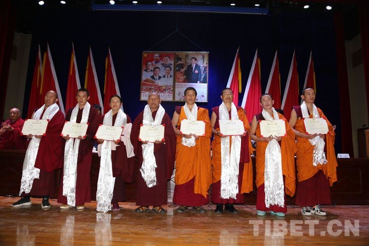 畢業(yè)典禮上,學(xué)院第三屆預(yù)備班111名學(xué)員被授予“聶當(dāng)?禪然巴”初級(jí)學(xué)銜,2017級(jí)學(xué)制班130名學(xué)員被授予“智然巴”中級(jí)學(xué)銜,其中密宗班33名學(xué)員,由中國佛教協(xié)會(huì)西藏分會(huì)與西藏佛學(xué)院,共同授予“聶當(dāng)?額然巴”學(xué)銜。