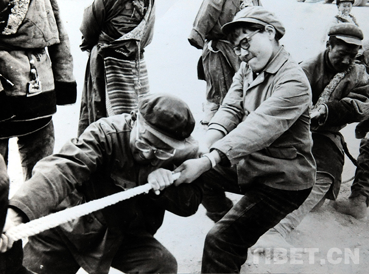 1976年盛夏,雙湖辦事處(現(xiàn)雙湖縣)副書(shū)記次仁玉珍(中)在進(jìn)行拔河比賽。這是西藏開(kāi)發(fā)藏北無(wú)人區(qū)后,雙湖辦事處為拓荒者首次舉辦的體育活動(dòng)(唐召明翻拍資料圖片)