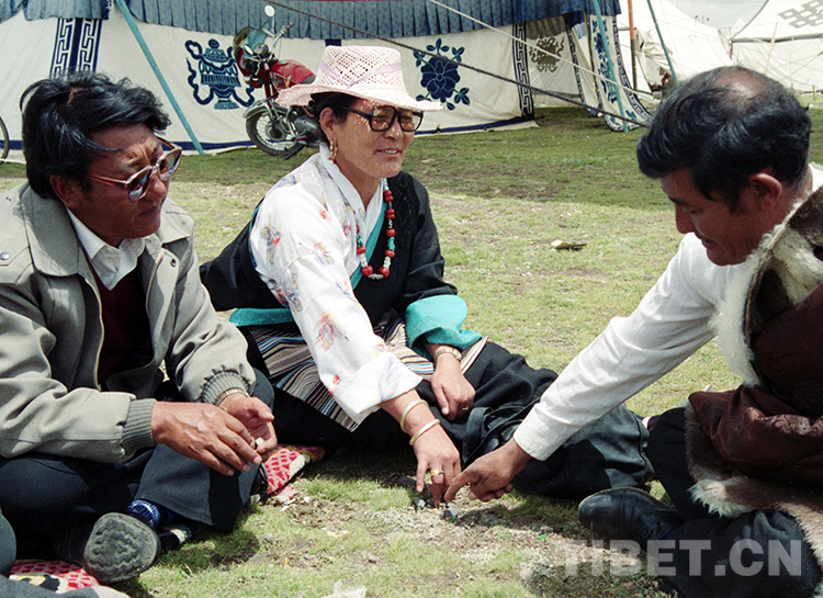 1987年盛夏,時(shí)任那曲地區(qū)(現(xiàn)那曲市)行署副專員的次仁玉珍(中)在那曲賽馬會(huì)的帳篷前,席地而坐與那曲地區(qū)行署專員土登才旺(左)、那曲地區(qū)文化局局長(zhǎng)阿布(右)在交流(唐召明1987年攝)