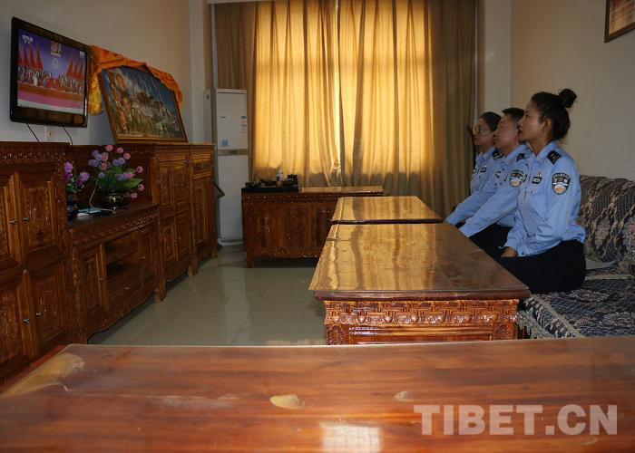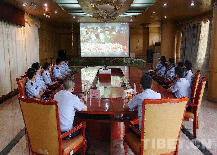 圖為西藏出入境邊防檢查總站執(zhí)法調(diào)查支隊(duì)廣大民警收聽收看慶祝西藏和平解放70周年大慶直播盛況