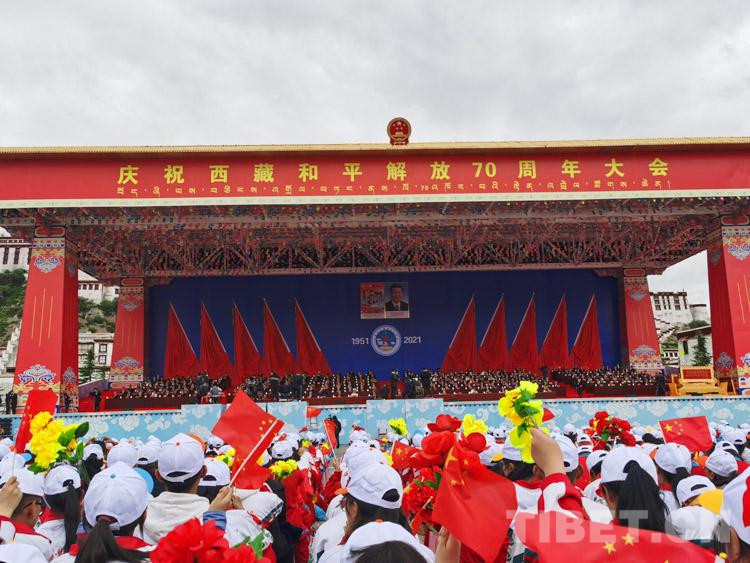 古城拉薩彩旗招展、花團(tuán)錦簇,處處洋溢著歡樂(lè)喜慶的節(jié)日氛圍。雄偉的布達(dá)拉宮下,搭建起藏式風(fēng)格的大會(huì)主席臺(tái)。主席臺(tái)上方,莊嚴(yán)的國(guó)徽和“慶祝西藏和平解放70周年大會(huì)”橫幅分外醒目,背景墻上懸掛著大慶會(huì)徽和“1951”“2021”字樣,10面紅旗分列兩側(cè)。主席臺(tái)對(duì)面的布達(dá)拉宮廣場(chǎng)上,身著節(jié)日盛裝的各族群眾從四面八方早早匯聚到這里,揮舞著手中的國(guó)旗、花束,匯聚成一片歡樂(lè)的海洋。