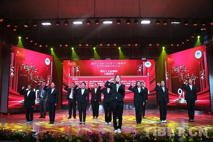 老前輩們的諄諄教誨,激勵(lì)著莘莘學(xué)子健康成長(zhǎng)。他們勤勤懇懇做事、踏踏實(shí)實(shí)做人的優(yōu)良作風(fēng),也讓青年教師頗受觸動(dòng)。墨竹工卡縣今年新入職的13位教師走上舞臺(tái),舉起右手,面對(duì)墨竹工卡縣各族各界代表及師生代表許下他們的鏗鏘誓言。