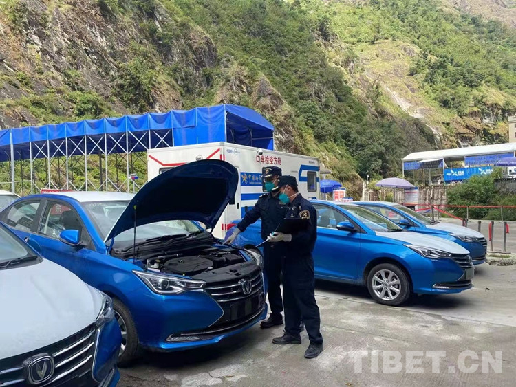 圖為拉薩海關(guān)關(guān)員驗放出口車輛