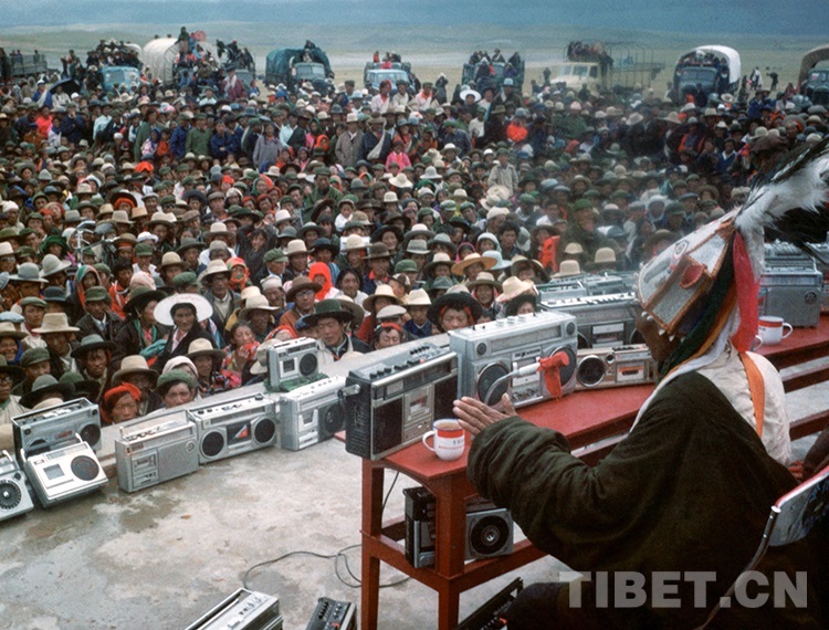 圖為說唱藝人阿達(dá)在西藏那曲賽馬會(huì)上說唱《格薩爾》的傳奇故事,臺(tái)上擺滿了牧民群眾的各式錄音機(jī)(才龍1985年前后攝)