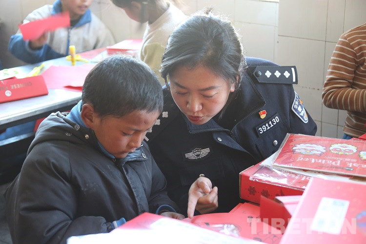 圖為拉薩邊檢站民警和孩子們共同完成手工剪紙 攝影:王佳豪