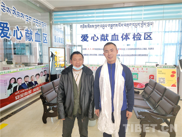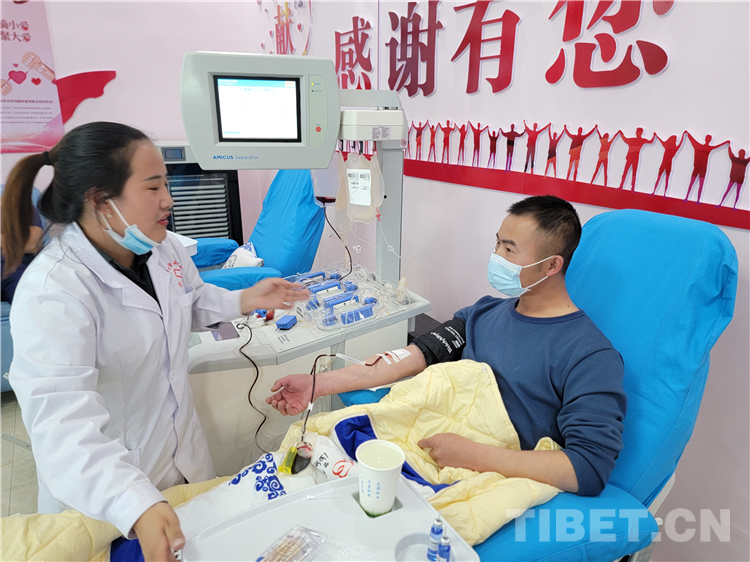 圖為那曲市森林消防大隊消防員張玉熙(右一)為那曲市人民醫(yī)院一名病人捐獻(xiàn)急需的B型血血小板