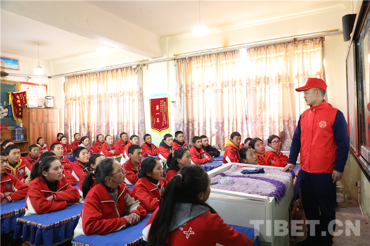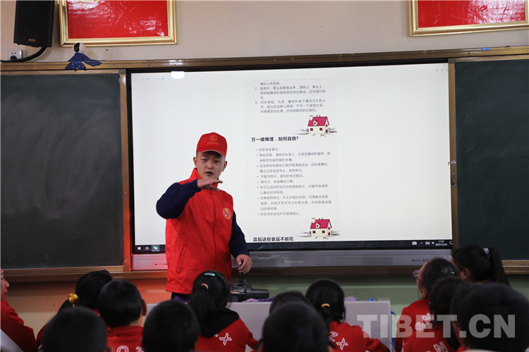 圖為那曲市森林消防大隊志愿者來到駐地附屬中學(xué)為師生們講解地震自救相關(guān)常識