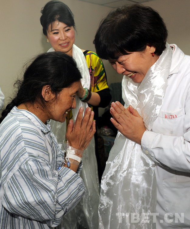 這是術(shù)后準(zhǔn)備出院的藏族婦女才塔爾(前左)在北京安貞醫(yī)院向為自己做手術(shù)、幫著捐款的醫(yī)生顧虹敬獻哈達,并雙手合十致謝(唐召明2013年4月15日攝)