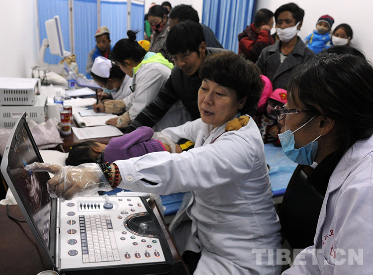 這是北京安貞醫(yī)院醫(yī)生顧虹在班戈縣人民醫(yī)院為當(dāng)?shù)貎和M行先天性心臟病篩查(唐召明2015年10月8日攝)
