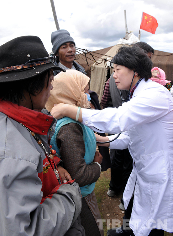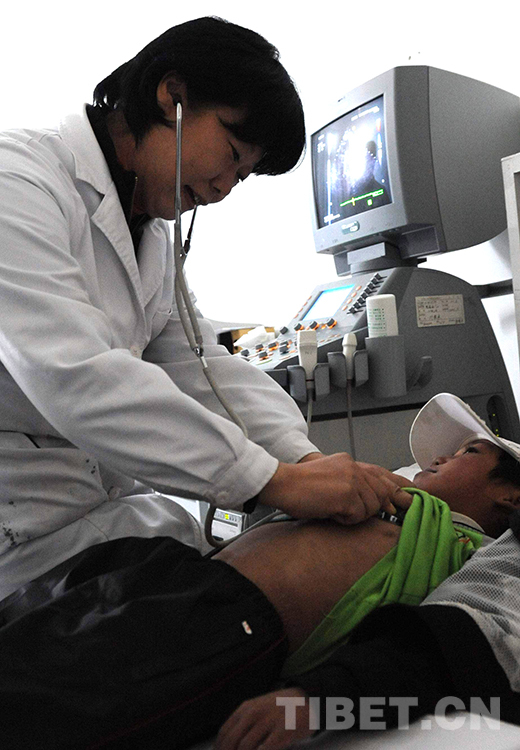 這是北京安貞醫(yī)院醫(yī)生顧虹在當(dāng)雄縣納木錯鄉(xiāng)為牧民群眾進行先天性心臟病篩查(唐召明2012年7月29日攝)