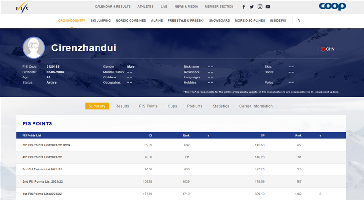 圖為國際雪聯(lián)官網(wǎng)運動員次仁占堆介紹