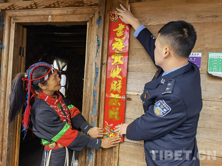 圖為林芝達(dá)木邊境派出所民警與轄區(qū)群眾共度春節(jié),為家里貼春聯(lián) 攝影:王濤