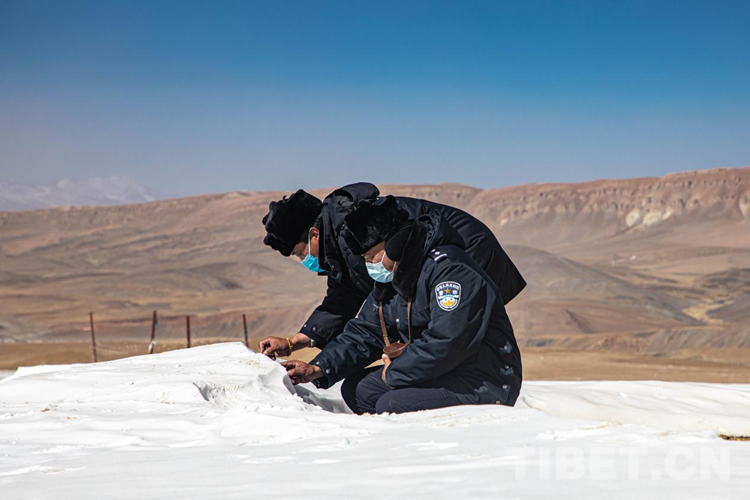 到達(dá)踏查點(diǎn),那里有一個(gè)由大小差不多的石頭壘起來、高50厘米左右的半圓形石堆,這就是他們踏查的避風(fēng)港。普瓊手執(zhí)國旗佇立在石頭上,嘎色拿出胸前的望遠(yuǎn)鏡,觀察四周有無異樣。風(fēng)不停地襲擾,但他們就像雕塑一樣,誓死捍衛(wèi)著腳下的領(lǐng)土。