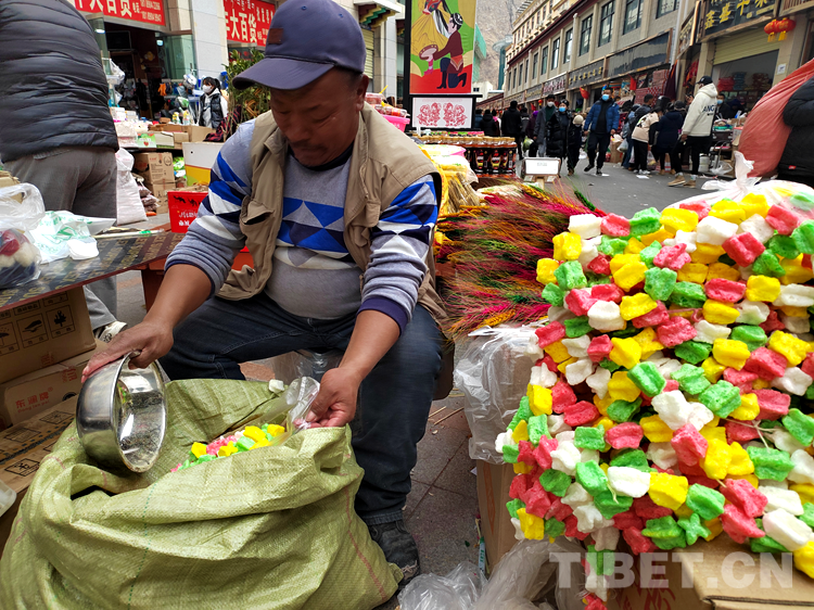 拉巴頓珠正忙碌著擺售賣年貨。喧鬧聲、音樂(lè)聲交織在一起,奏響了迎接新年的華美樂(lè)章。拉巴頓珠告訴記者,賣自家制作的年貨有幾天了,生意好得很。